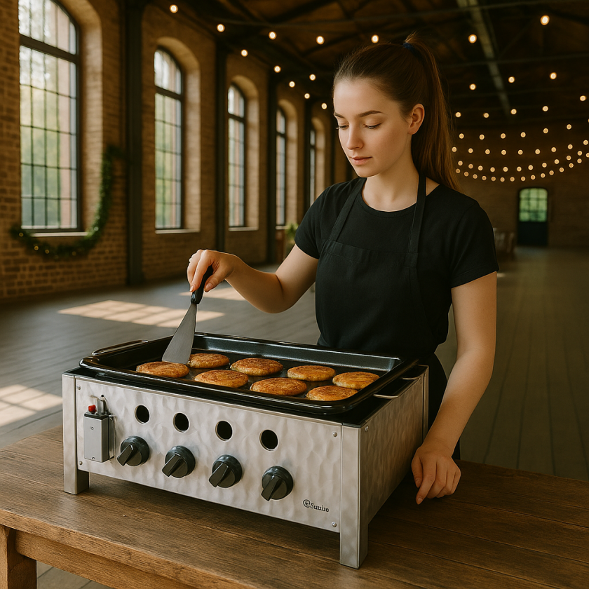 Mit unserem leistungsstarken Crêpesmaker zaubern Sie im Handumdrehen frische, goldbraune Crêpes – süß oder herzhaft, ganz nach Geschmack. Die hochwertige, gleichmäßig beheizte Backplatte sorgt für perfekte Ergebnisse und ein authentisches Genusserlebnis. Robust verarbeitet, leicht zu bedienen und für den Dauereinsatz auf Veranstaltungen konzipiert, ist der Crêpesmaker die ideale Ergänzung für Hochzeiten, Firmenfeiern, Straßenfeste oder private Partys.