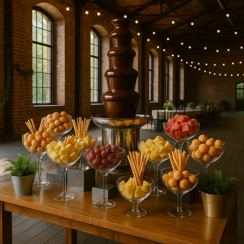Mit unserem exklusiven 5 stöckigen Schokobrunnen schaffen Sie ein echtes Highlight auf Hochzeiten, Firmenfeiern und privaten Festen. Der fünfstöckige Brunnen überzeugt durch seine imposante Höhe und ein Fassungsvolumen von bis zu 6 kg Kuvertüre – ideal, um Früchte, Gebäck oder Snacks stilvoll zu umhüllen. Gleichmäßig fließende Schokolade sorgt für Genuss und ein beeindruckendes Ambiente. Robust, leicht zu reinigen und für den professionellen Einsatz geeignet.