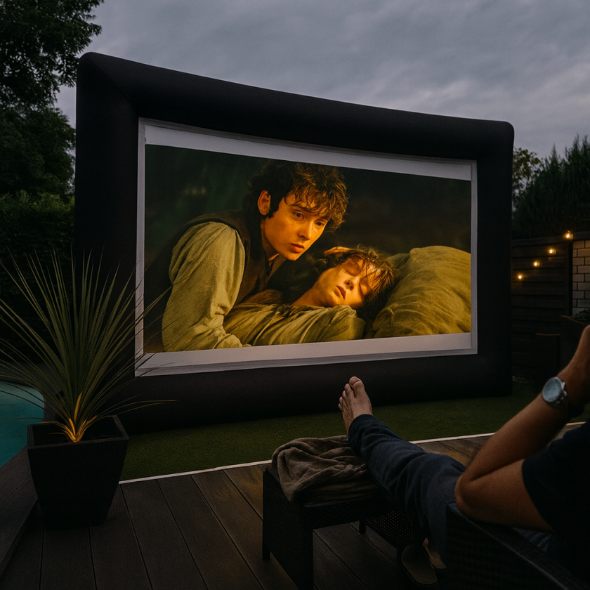Diese beeindruckende aufblasbare Großleinwand mit einer Breite von 6 Metern und einer Bilddiagonale von 180 Zollverwandelt jeden Garten, jede Terrasse oder Eventfläche in ein echtes Open-Air-Kino.